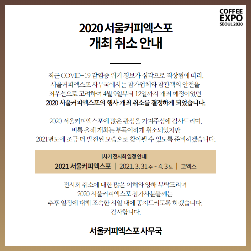 2020 서울커피엑스포 개최 취소 [Coffee Expo Seoul 2020] Cancellation Notice