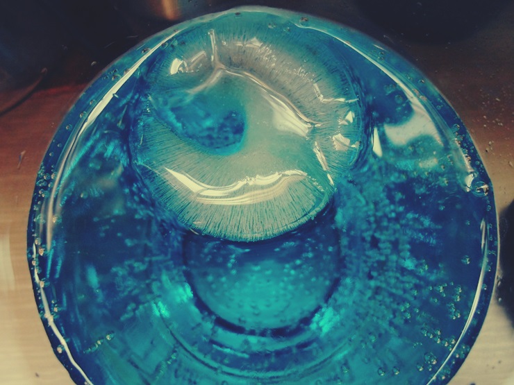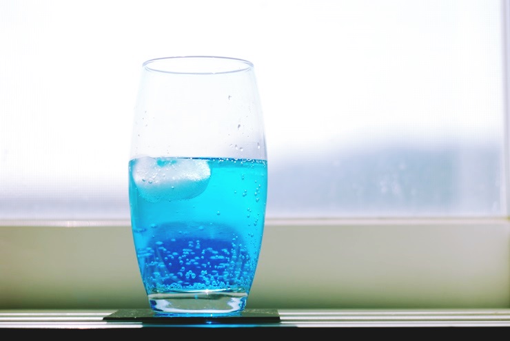 This time, we put about 40ml of CURACAO BLEU syrup in carbonated water.