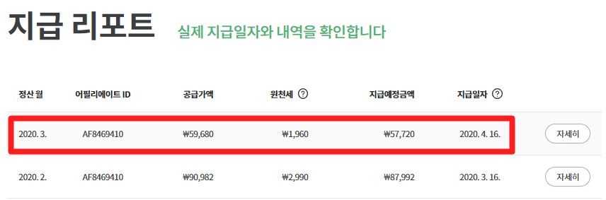 아래 사진을 보면 정산월이 2020.3. 로 되어있는것이 2월달 수익입니다. 3월에 정산이 되었고,