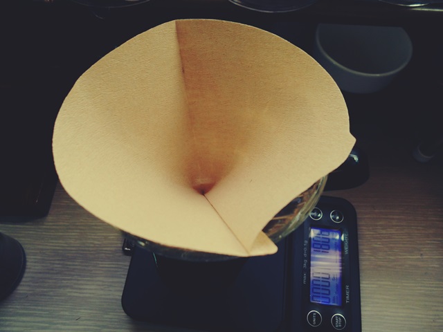 이제 린싱이 끝난 하리오 V60 드리퍼 위에 원두를 쏟아 붓습니다.