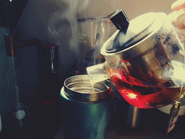 텀블러에 따스한 음료를 담아 자전거를 타며 동네근처를