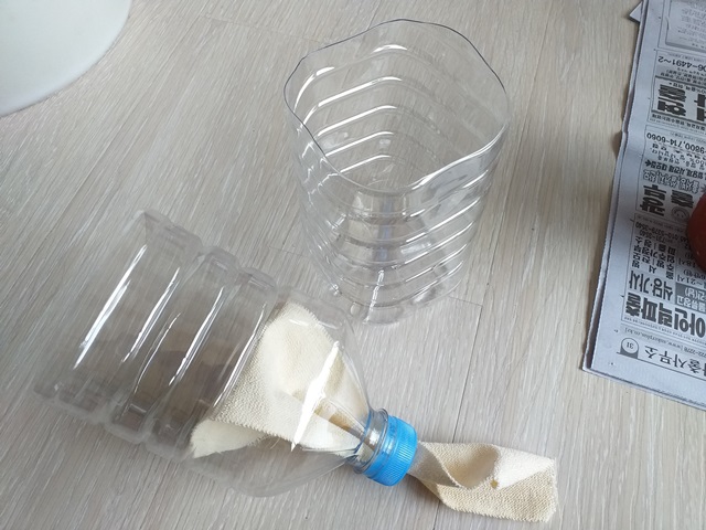 페트병을 반으로 잘라 헝겊이나 거즈를 이용해 연결해 줍니다.