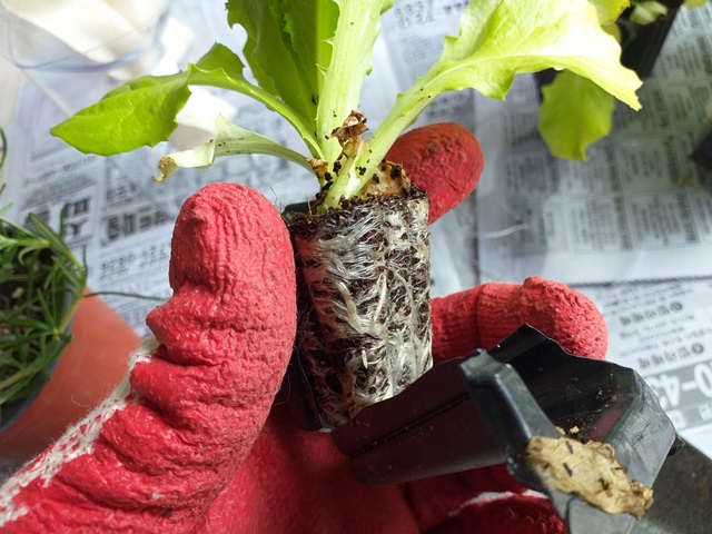모종을 판에서 뽑아보니 상추 뿌리가 엄청 많이 자라있네요.