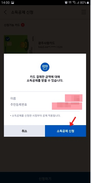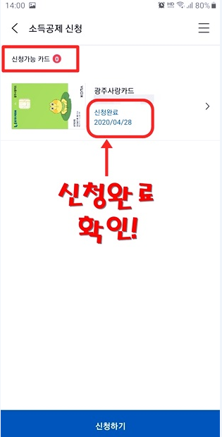 선택했던 카드가 소득공제 신청완료가 되었다는 것이 보이면