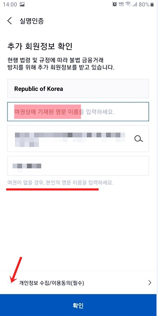 입력 후, 아래 개인정보 수집에 체크하고, 확인을 누릅니다.