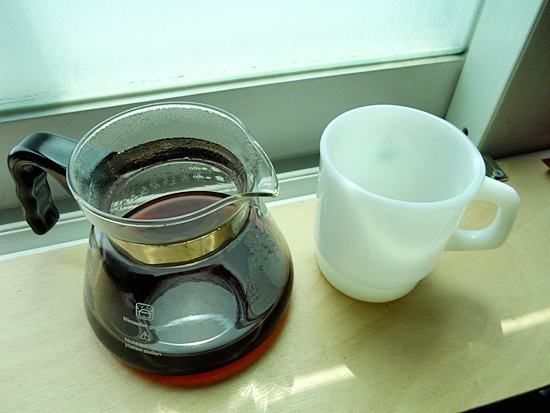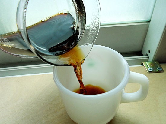 커피서버에 담긴 커피를 머그잔으로 옮겨담습니다.