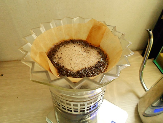 뜨거운 물을 원두가루 전체가 적셔질 정도로만 부어
