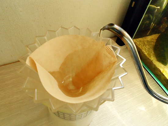 종이필터를 접어 넣고, 뜨거운 물을 부어 린싱작업을 합니다.