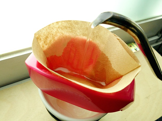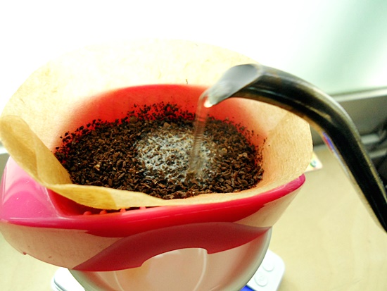 이제 뜨거운 물을 원두가루 전체를 적실정도로만 부어
