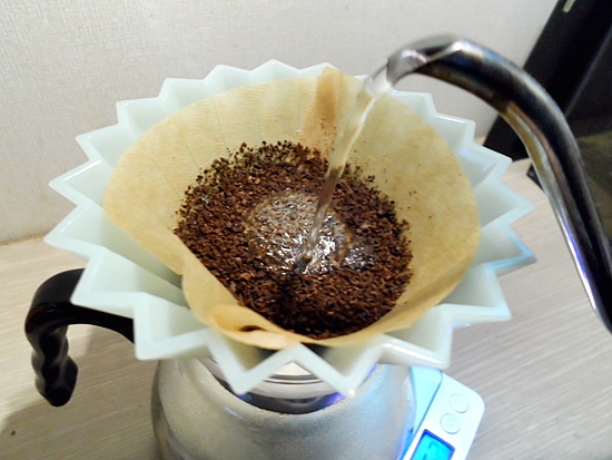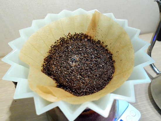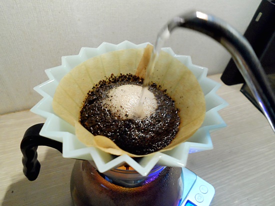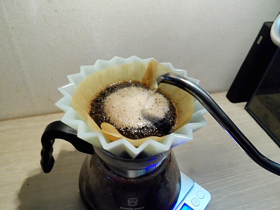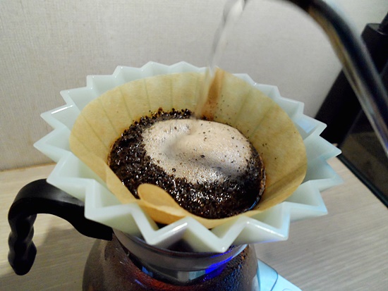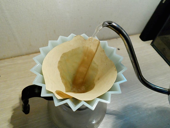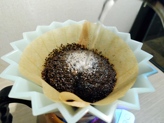 그리고 뜨거운 물을 원두가루 전체를 적실정도로만 부어
