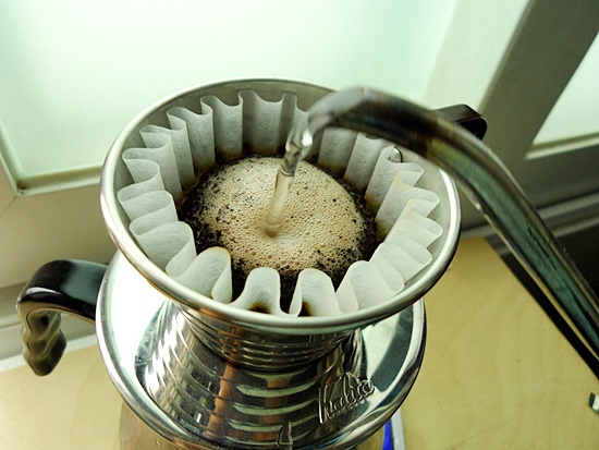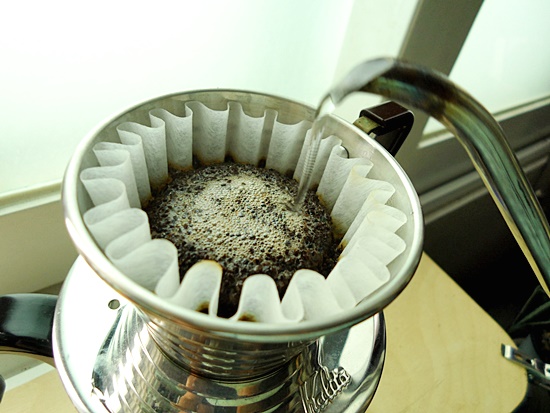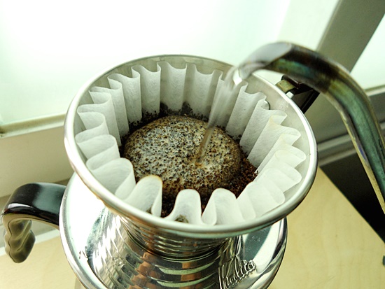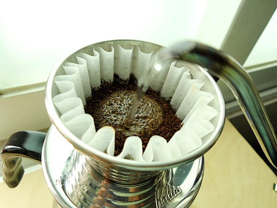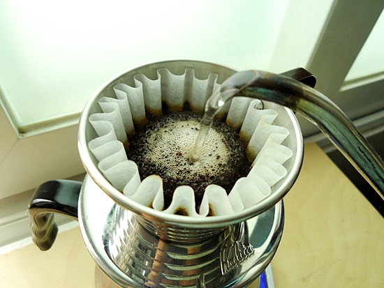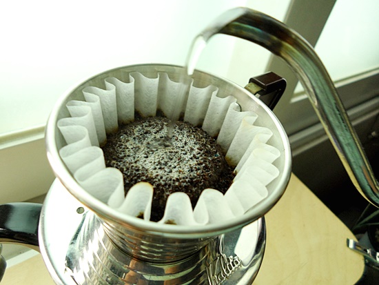 원두가루 전체를 적실정도로 뜨거운 물을 부어