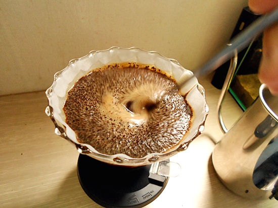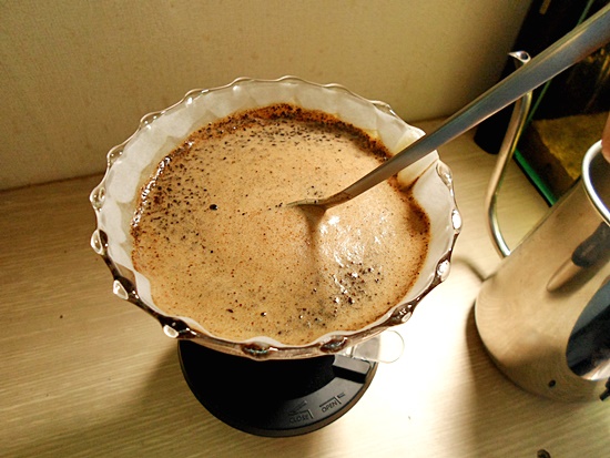 스푼으로 떠오른 원두가루들을 잘 저어 줍니다.