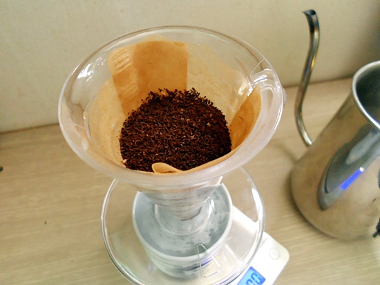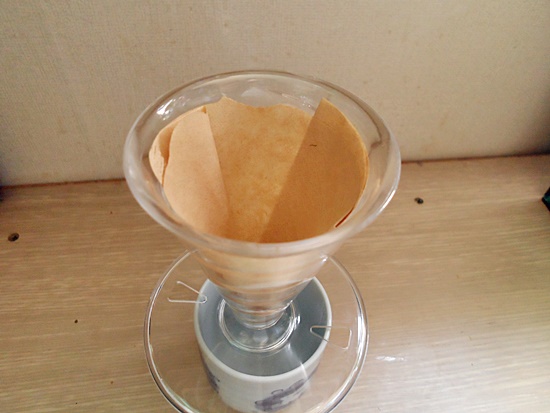 원두를 분쇄하여 종이필터 안에 붓습니다.