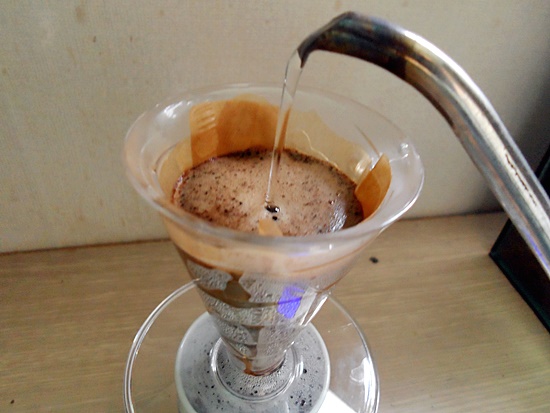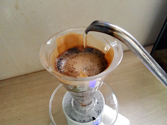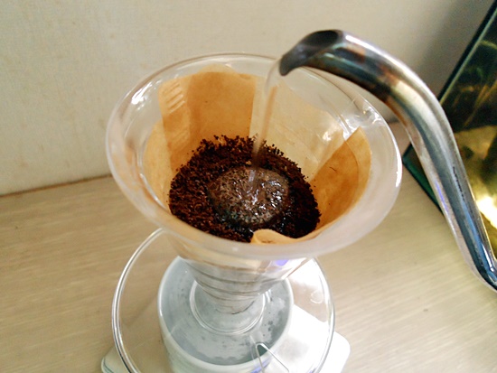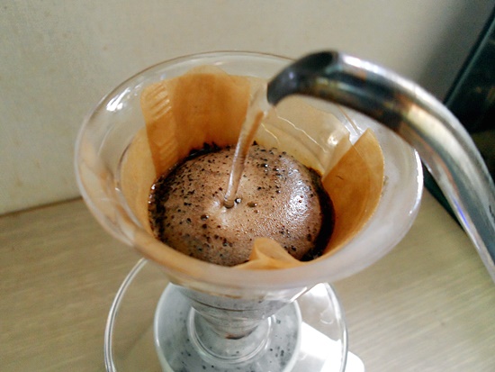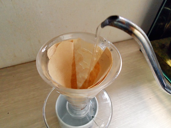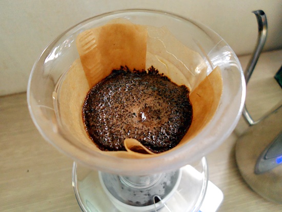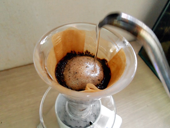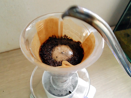 이제 뜨거운 물을 원두가루가 적셔질 정도로만 부어