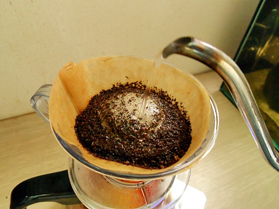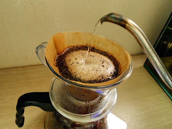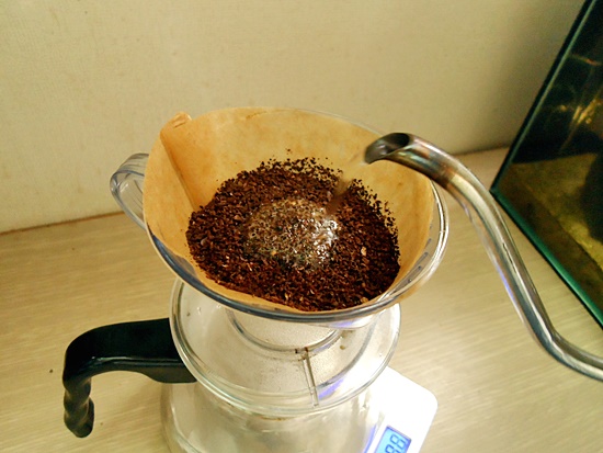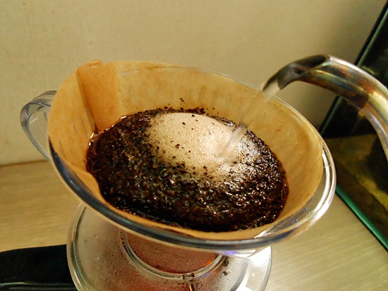 뜨거운 물을 원두가루 전체가 적셔질 정도로만 부어