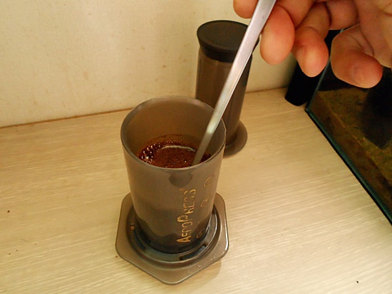 스푼으로 커피원두가루와 물이 잘 섞이도록 저어줍니다.