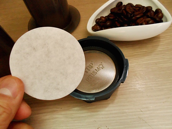 프리스모 필터캡에 종이필터를 넣어 에어로프레스와 결합합니다.