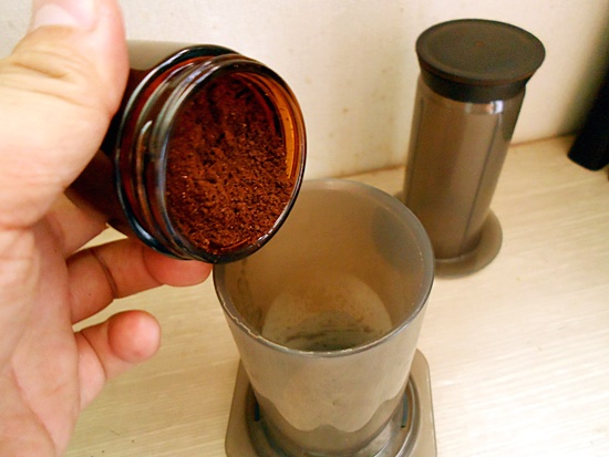 원두를 곱게 분쇄하여 에어로프레스에 넣고,
