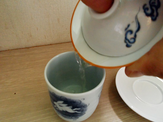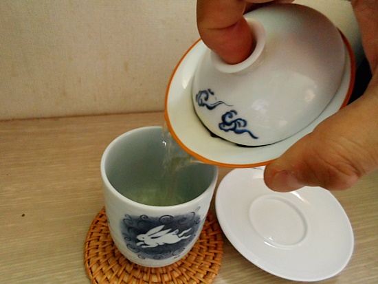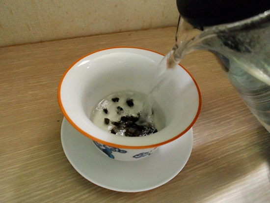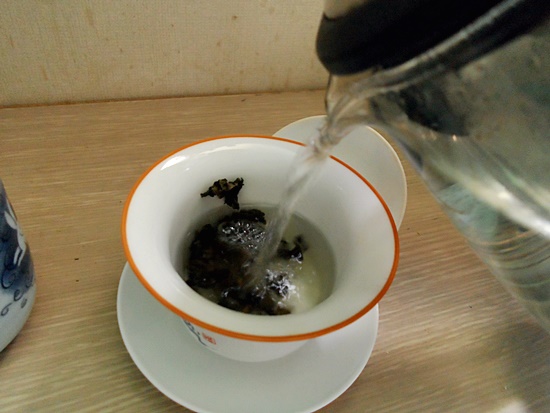개완 뚜껑을 닫아 1차로 우려진 우롱차를 잔에 담습니다.