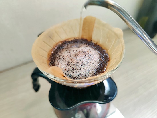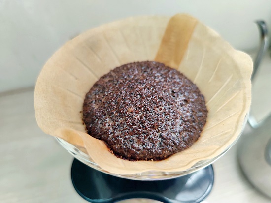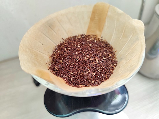 원두를 드립크기로 분쇄하여 린싱을 마친 종이필터에 붓습니다.