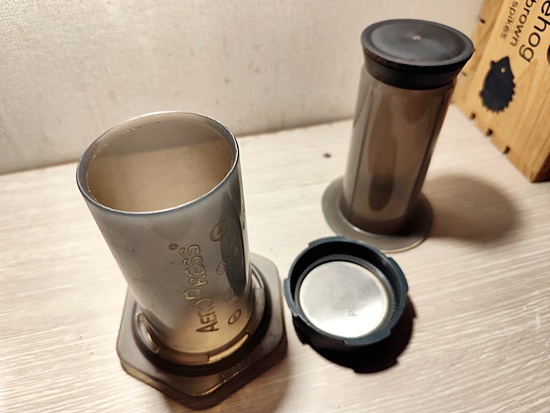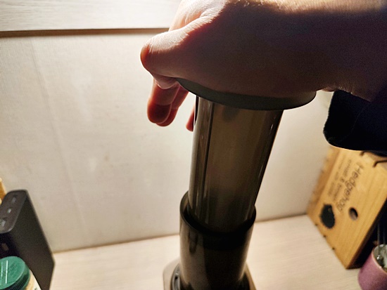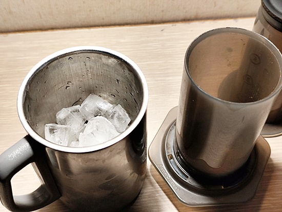 얼음을 담은 잔 위에 에어로프레스를 올려놓습니다.