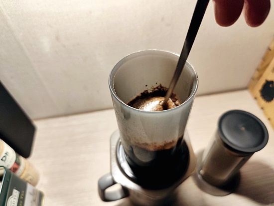 스푼으로 떠오른 원두가루들을 잘 저어 섞어줍니다.