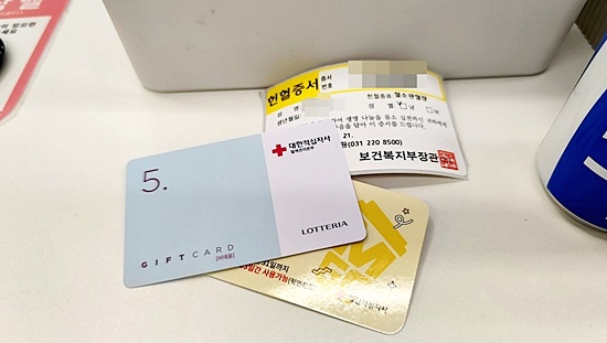 헌혈을 마치고, 헌혈증서와 이것저것 기념품을