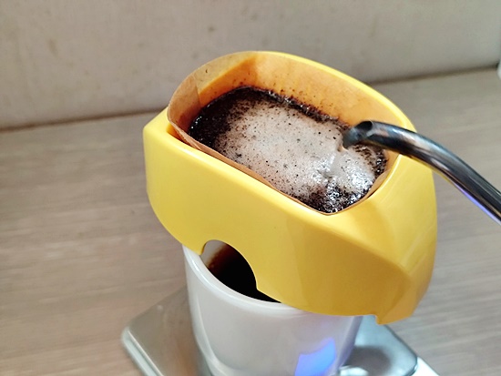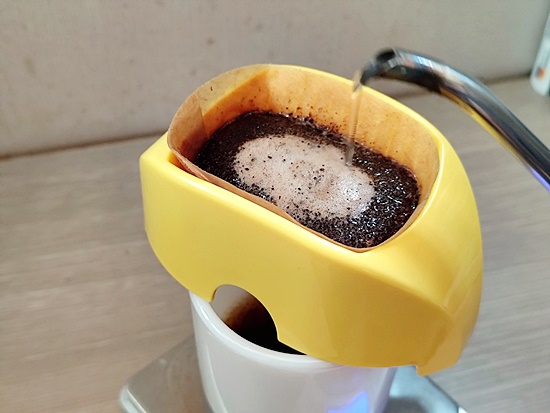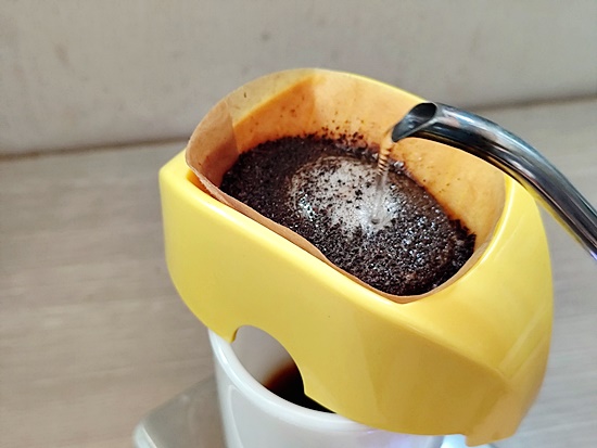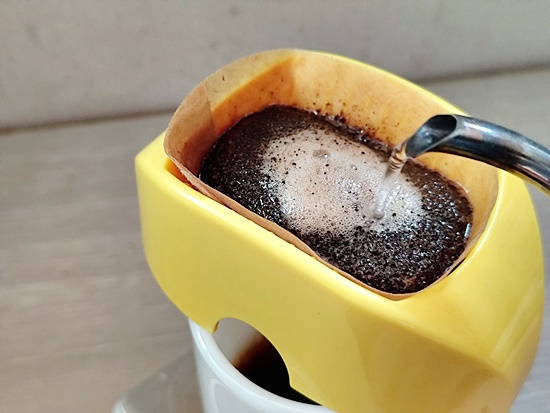 이어 뜨거운 물을 원두가루가 적셔질정도로만 부어