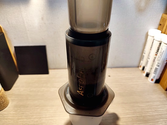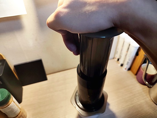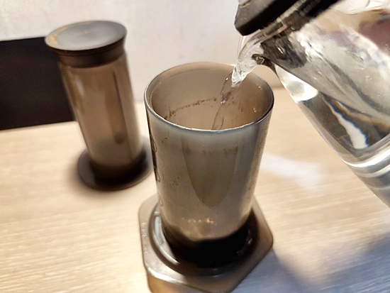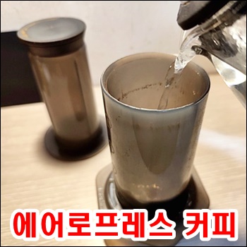 컵 위에 에어로프레스를 올려놓고,
