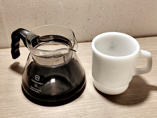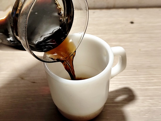 머그잔으로 추출된 커피를 옮겨담습니다.
