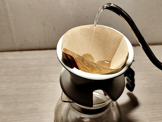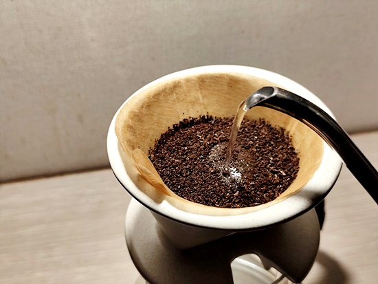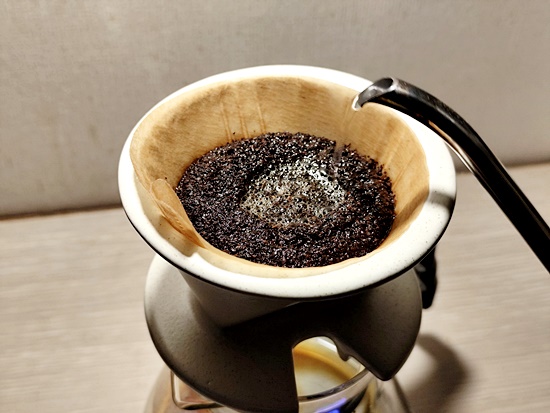 뜨거운 물을 원두가루가 적셔질 정도만 부어