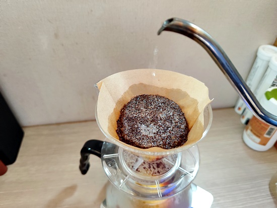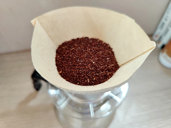 그리고 원두를 드립크기로 분쇄하여 종이필터에 부어줍니다.