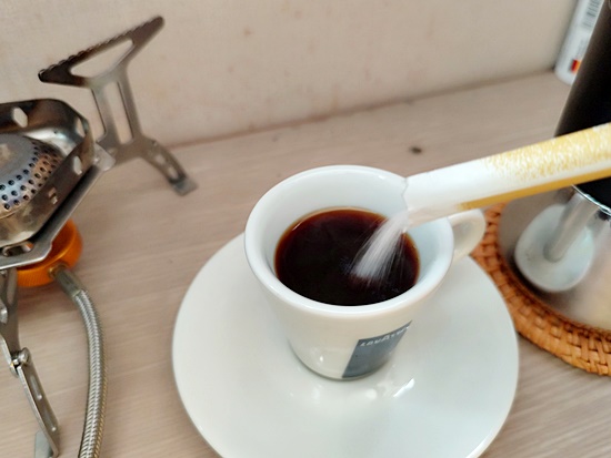 이렇게 진하게 내려진 커피에 설탕 스틱 한개를 넣어