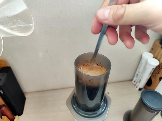 스푼으로 떠오른 원두가루를 잘 저어 섞어주고,
