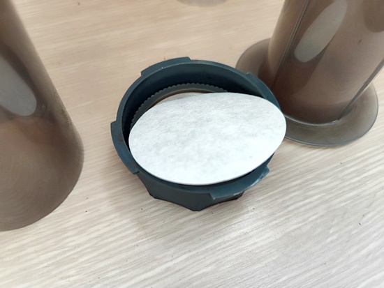 종이필터를 필터캡에 넣고, 에어로프레스와 결합합니다.