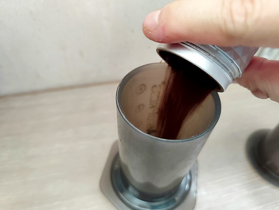 그리고 앞서 분쇄한 원두가루를 에어로프레스에 넣습니다.