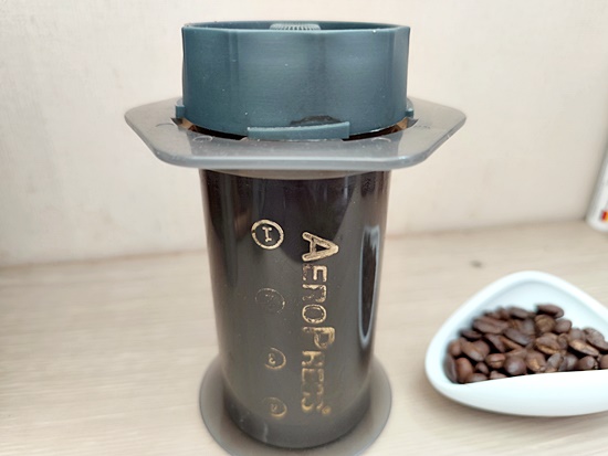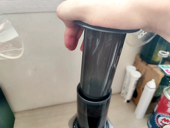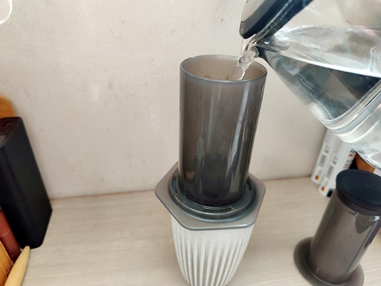 컵 위에 에어로프레스를 올려놓고 ,