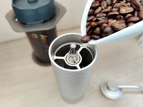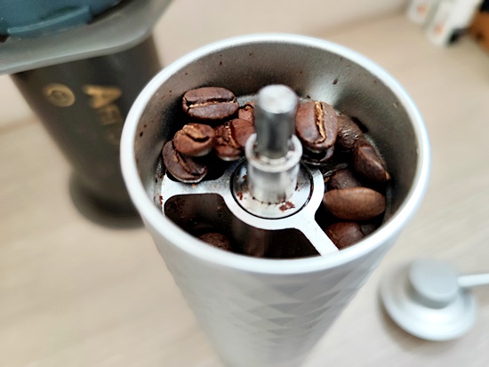 원두를 핸드밀에 넣어 곱게 분쇄해 줍니다.