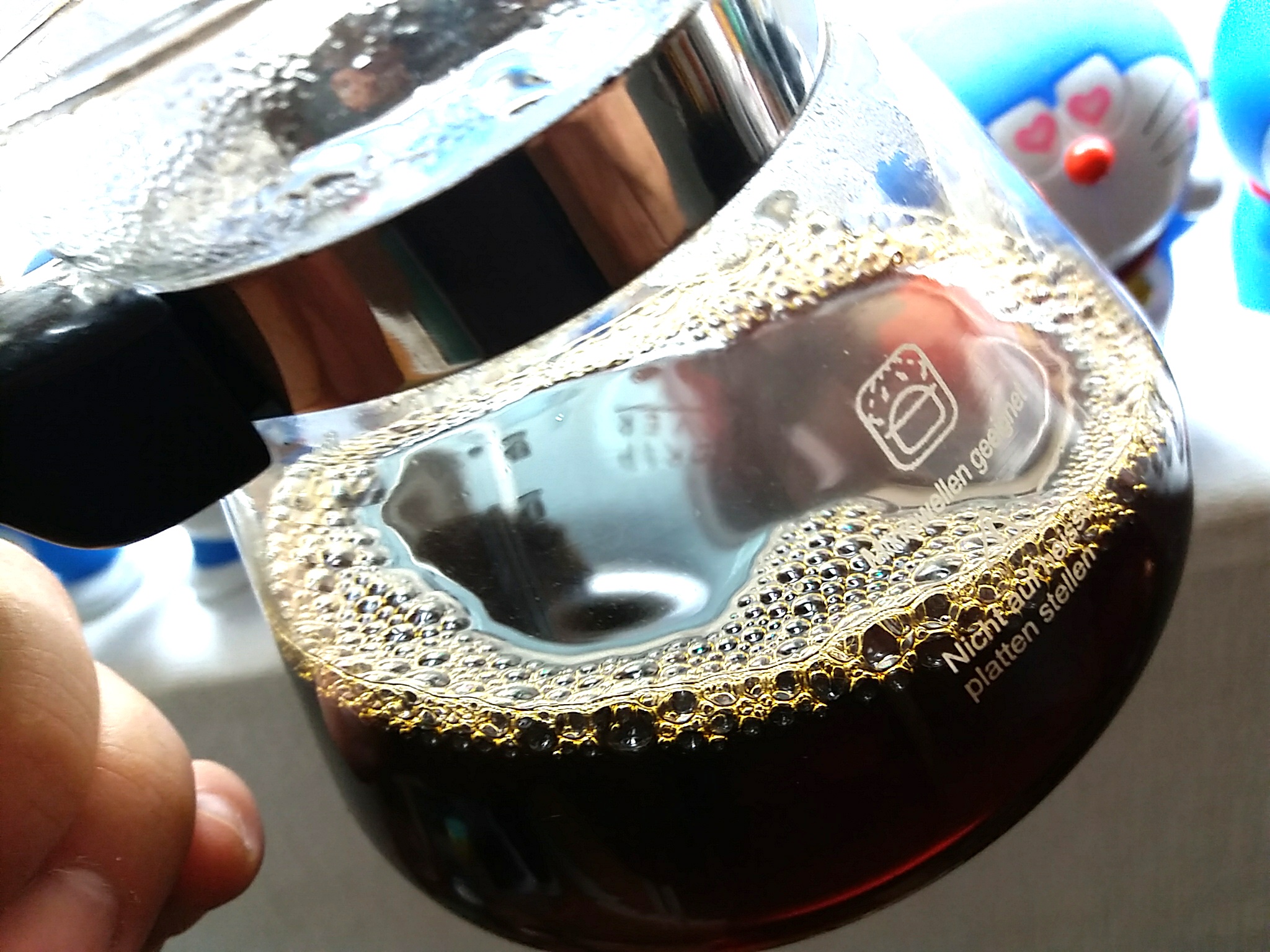 그리고 물을 붓고, 드리퍼 안의 물이 수평 이하로 빠지기 전에 다시 물을 부어줍니다.