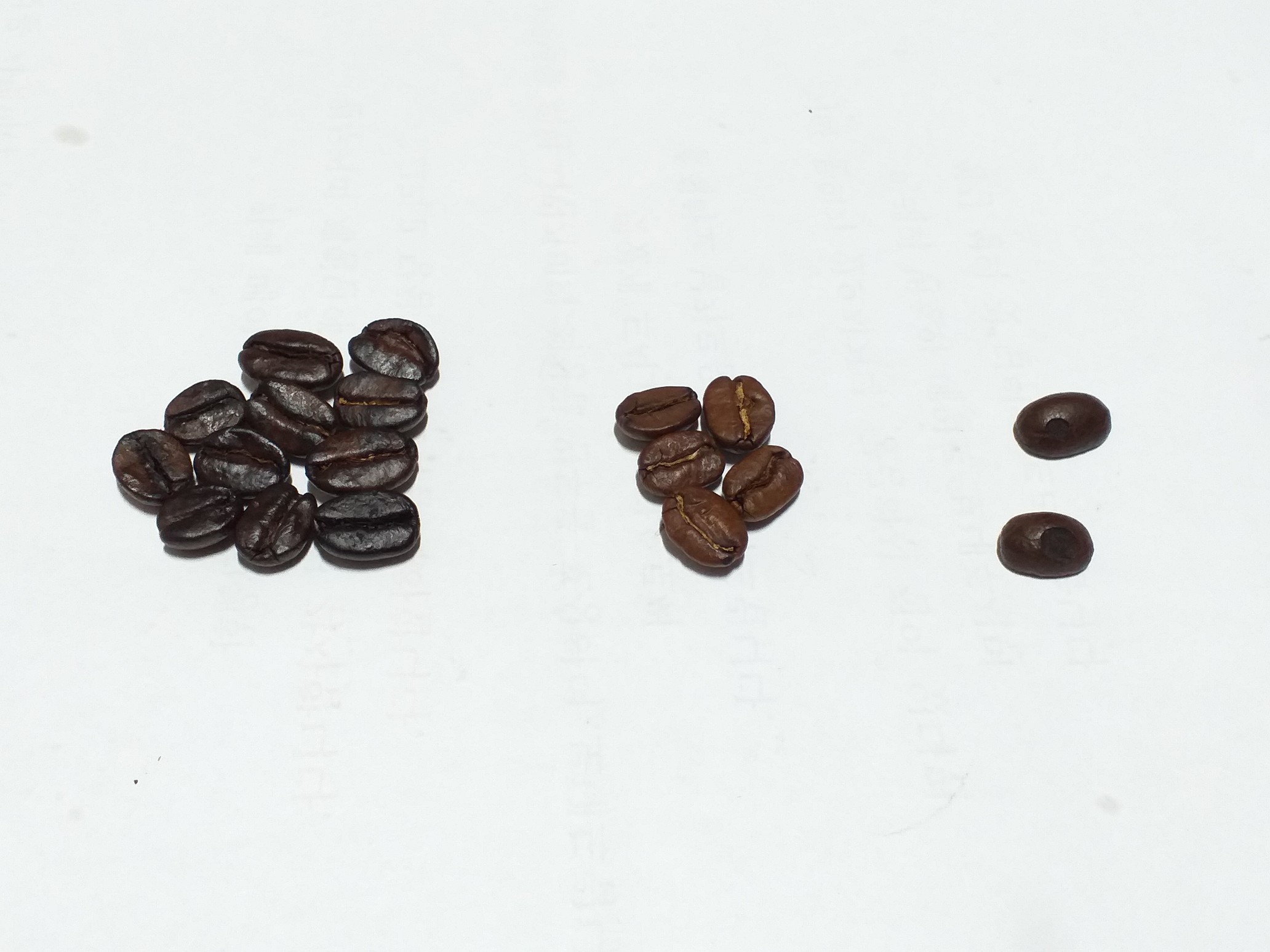 가운데 있는 원두가 제가 생각하기에 적절한 원두이고 왼쪽은 원두 표면이 군데군데 검게 그을린 원두이고,