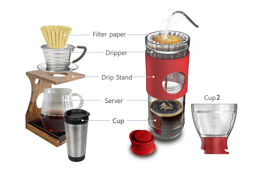 필터, 드리퍼, 서버, 드립 스탠드, 컵홀더, 컵 1, 컵 2, 보틀의 8가지 기능을