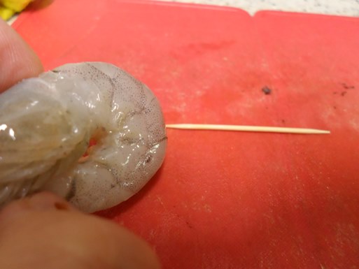 이제 새우 등속에 있는 내장을 제거할 겁니다.
