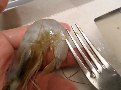 새우 옆몸통쪽에 포크 한쪽을 집어넣어,