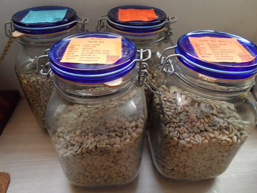 밀폐유리용기에 종류별로 1kg씩 4종의 생두가 채워졌습니다.