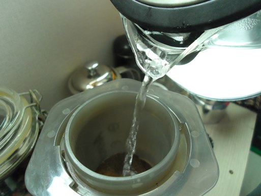 이제 에어로프레스에 뜨거운 물을 부어줍니다.