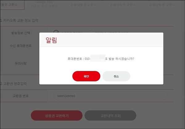 그리고 교환권 번호에 PIN번호 12자리를 입력하고, 상품권교환하기를 클릭합니다.