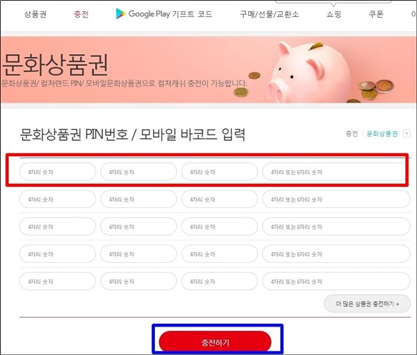 문화상품권 PIN번호 18자리를 입력할 수 있는 창이 나오고,