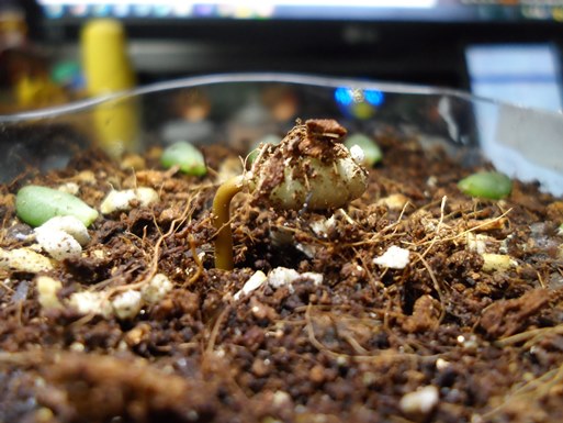 흙을 뚫고 나오느라 커피씨앗 머리에는 흙이 잔뜩 올려져있습니다.