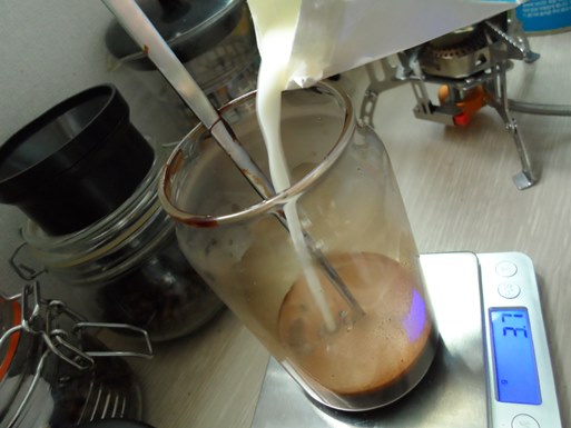 우유 150ml 정도를 넣어 다시 섞어줍니다.