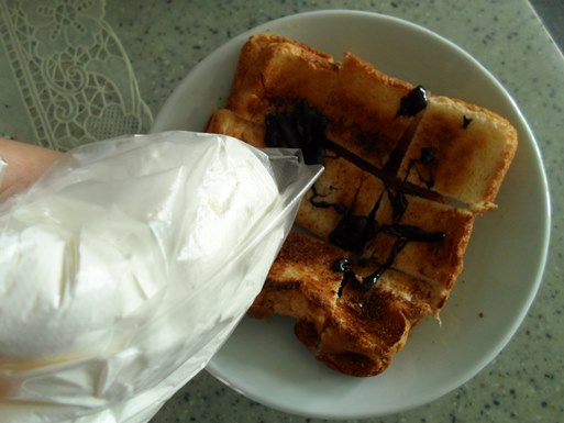 이제 초코소스를 컷팅한 식빵 위에 드리질링 해줍니다.